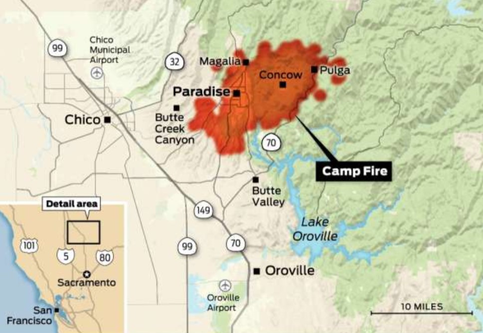 The Camp Fire erupted on November 8, 2018, at 6:30 a.m. in the area of Camp Creek Road and Pulga Road near Feather River Canyon in Pulga, Calif. The fire rapidly spread west toward Paradise, Calif. To date, the Camp Fire has consumed over 70,000 acres and is 0 percent contained. Cal Fire has not been able to conduct a survey of the number of homes destroyed but reports that it may be more than 1,000 homes damaged or destroyed. In addition, a number of commercial structures including restaurants, a hospital, school, and other commercial buildings have been damaged. Firefighting efforts have been hindered by fast-moving winds as the fire grew at a rate of 80 football fields per minute.